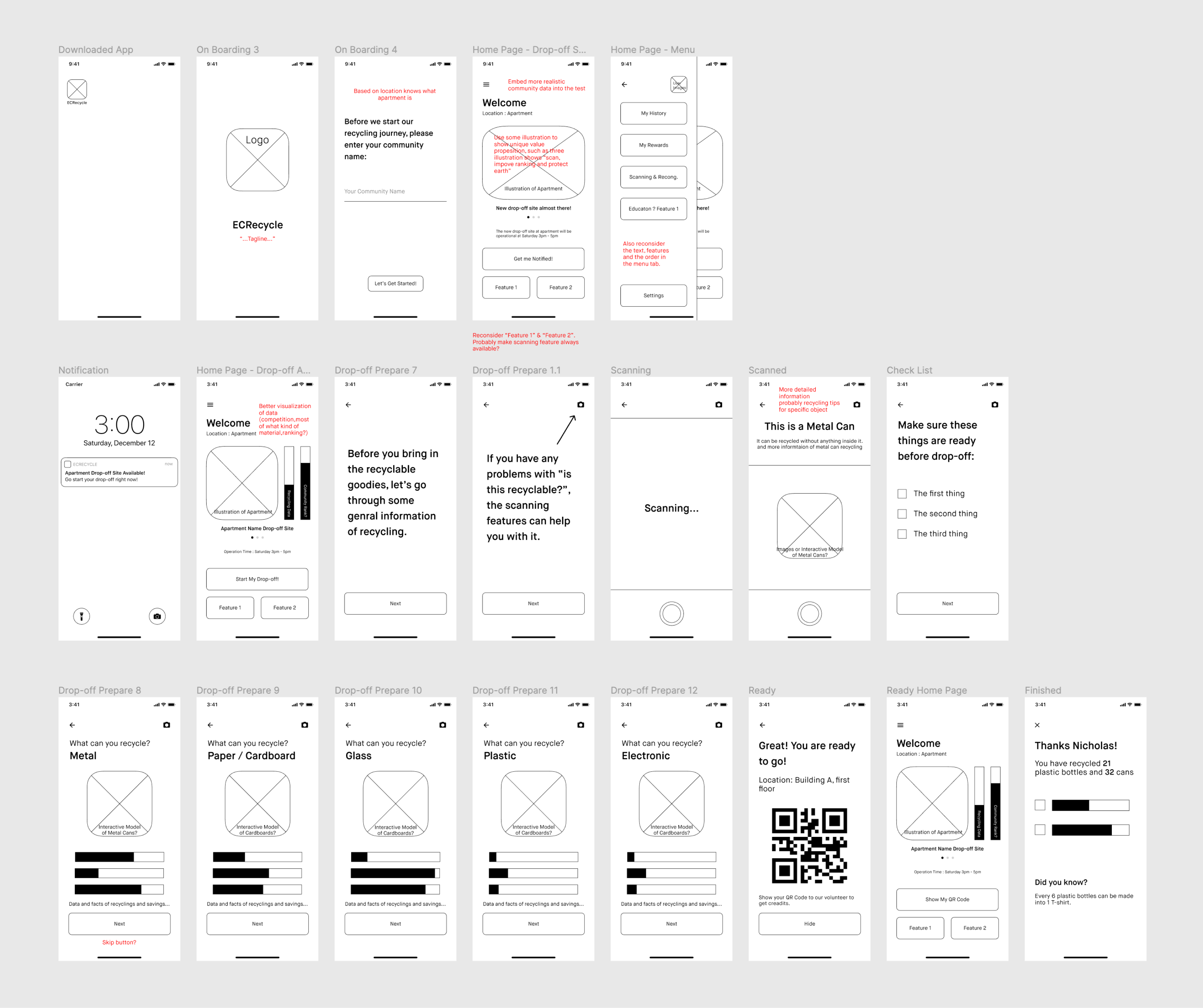 As our primary user scenario, we focused a lot on how the digital product plays a significant role in helping the user understand the knowledge, request and perform a recycle, and receive feedback more effectively. This was also when we started developing prototypes to accompany the scenario.