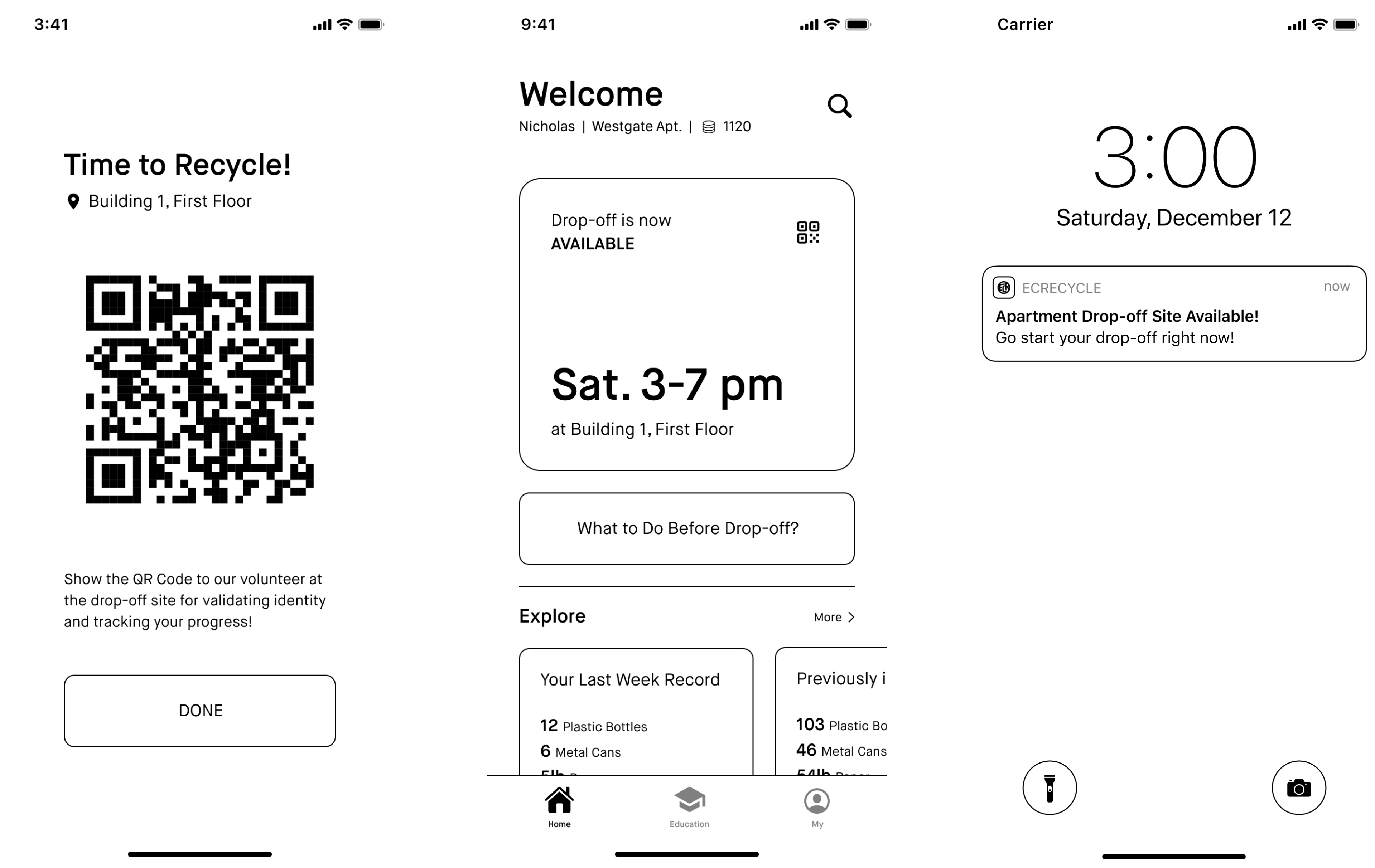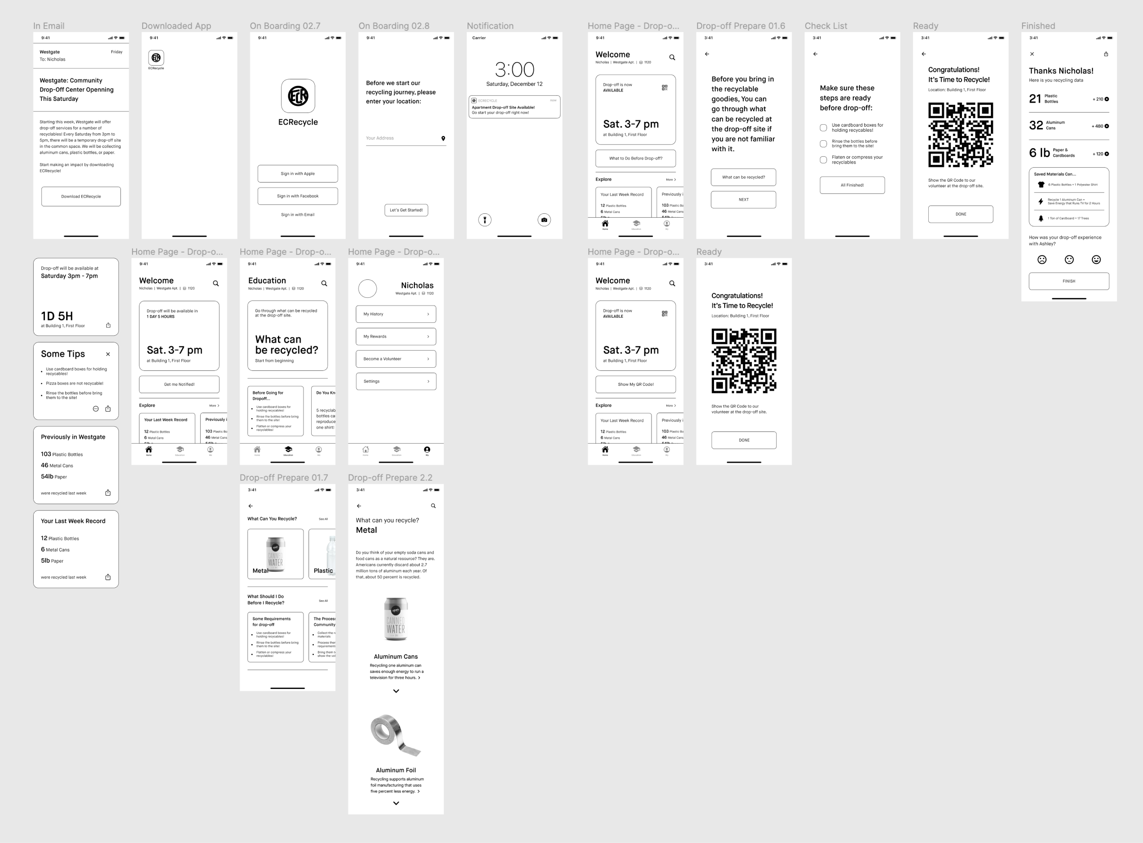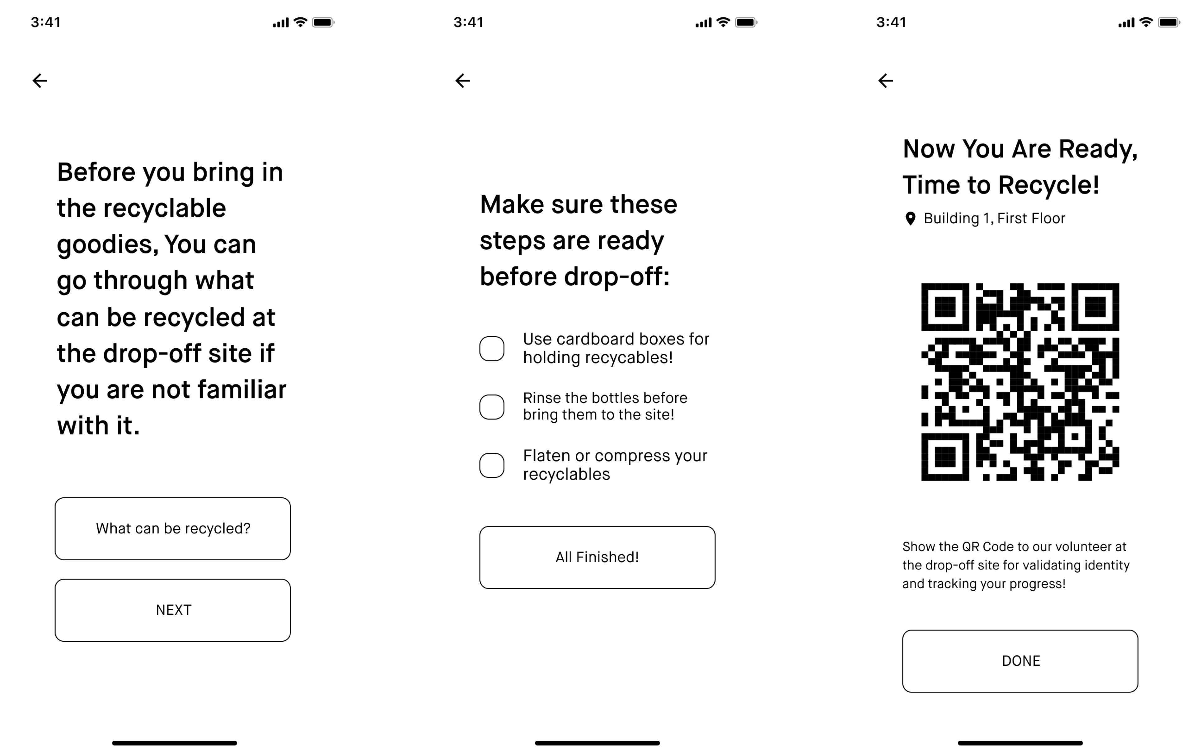As soon as the community drop-off service is available, the users who opt for notification will be notified. If the user is familiar with the process of drop-off recycling, they can directly go to the drop-off site with their QR code. Suppose the user is not familiar with the process. In that case, they can always choose "What to do?" to get acquainted with some basic recycling knowledge, a checklist to help him prepare his materials, and instruct him to the site.