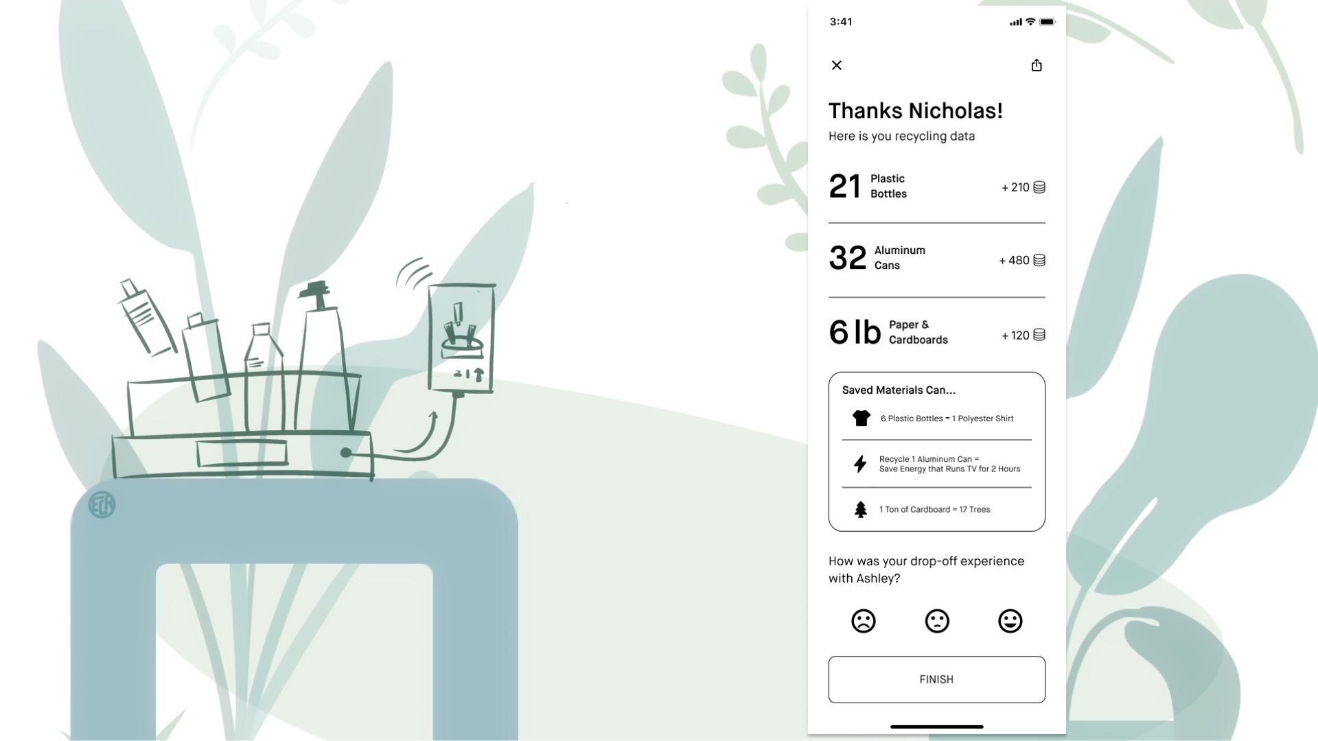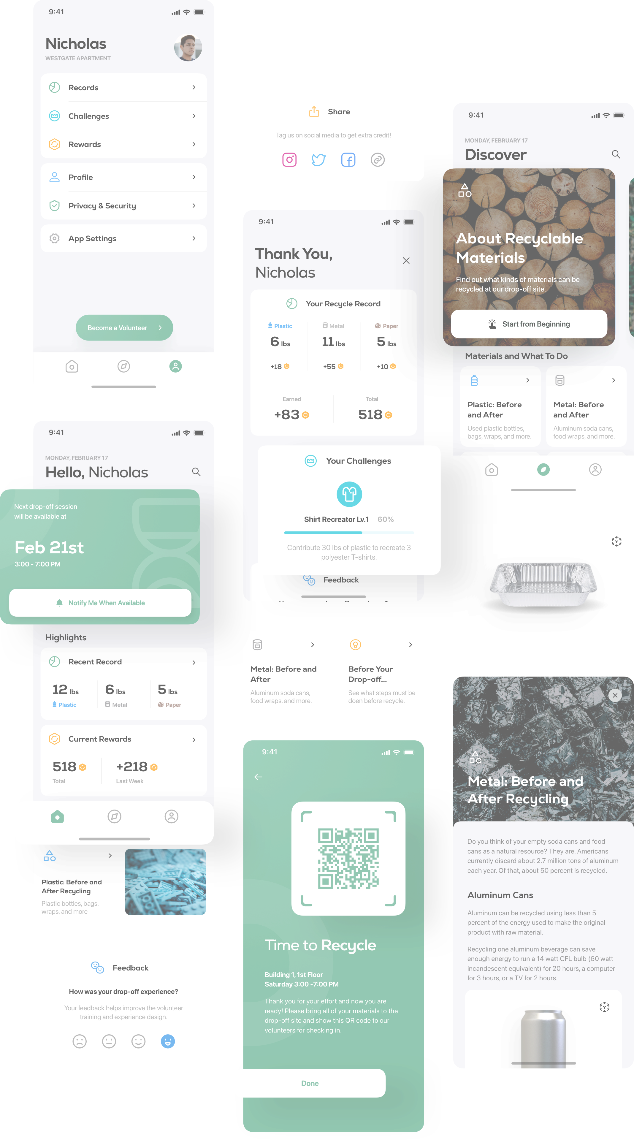 After finishing the recycling at the drop-off site, with the volunteer's help, the users will get detailed feedback, including their recycled materials, how many rewards they earned, what challenges they finished, and providing feedback on the whole experience. We hope this tracking and gamified experience can further encourage the users to keep participating the program and recycling effectively.