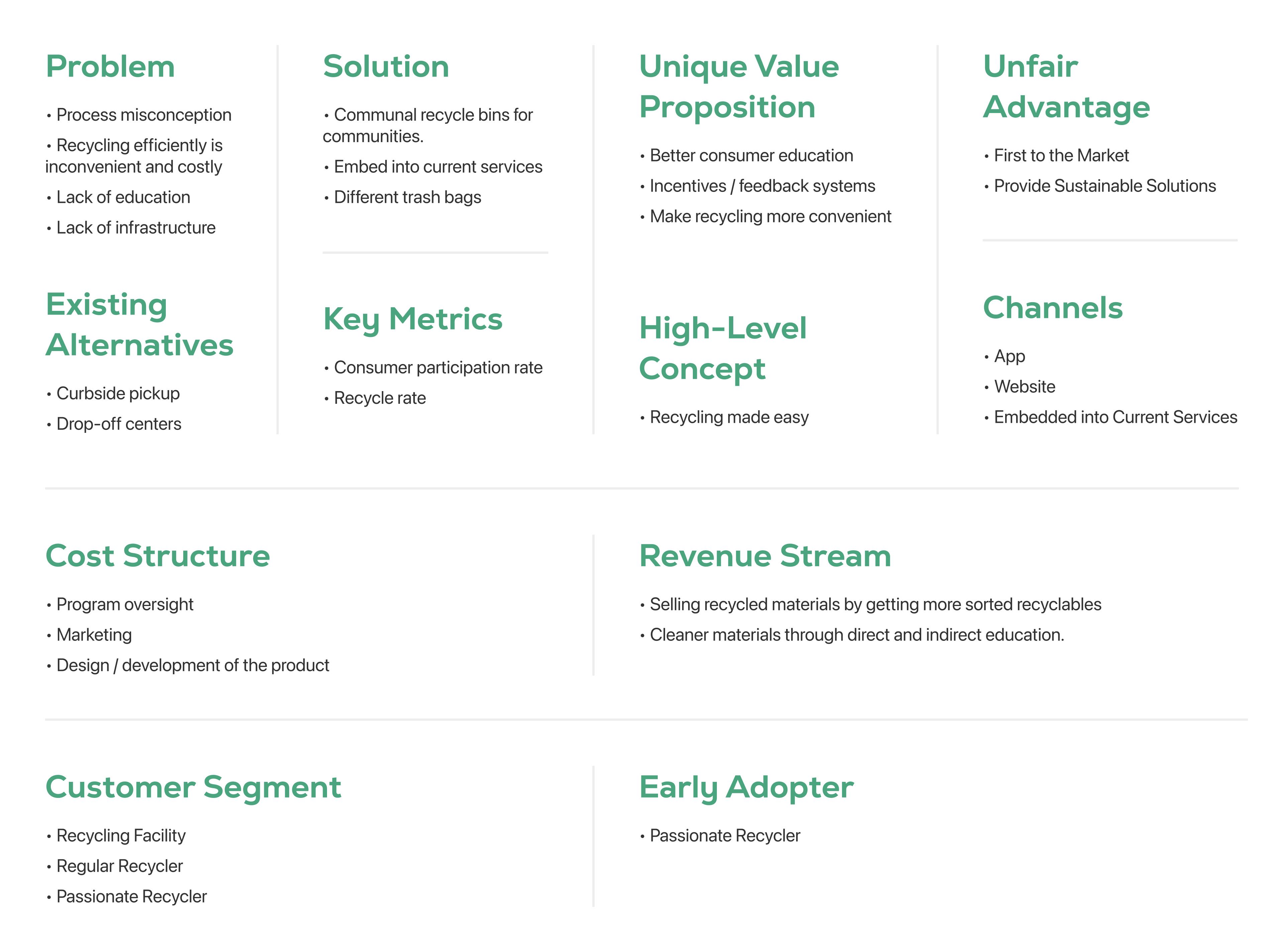 The lean canvas not only gave us a better overview of what our service is doing better compared to the available solutions but also led our way to make sure that our service is financially practical when we introduce it to the MRFs. This was when we decided that ECRecycle will be a communal program within the local community that involves both volunteers and recyclers while providing more convenient recycling services, more effective educational solutions, and more compelling motivations.