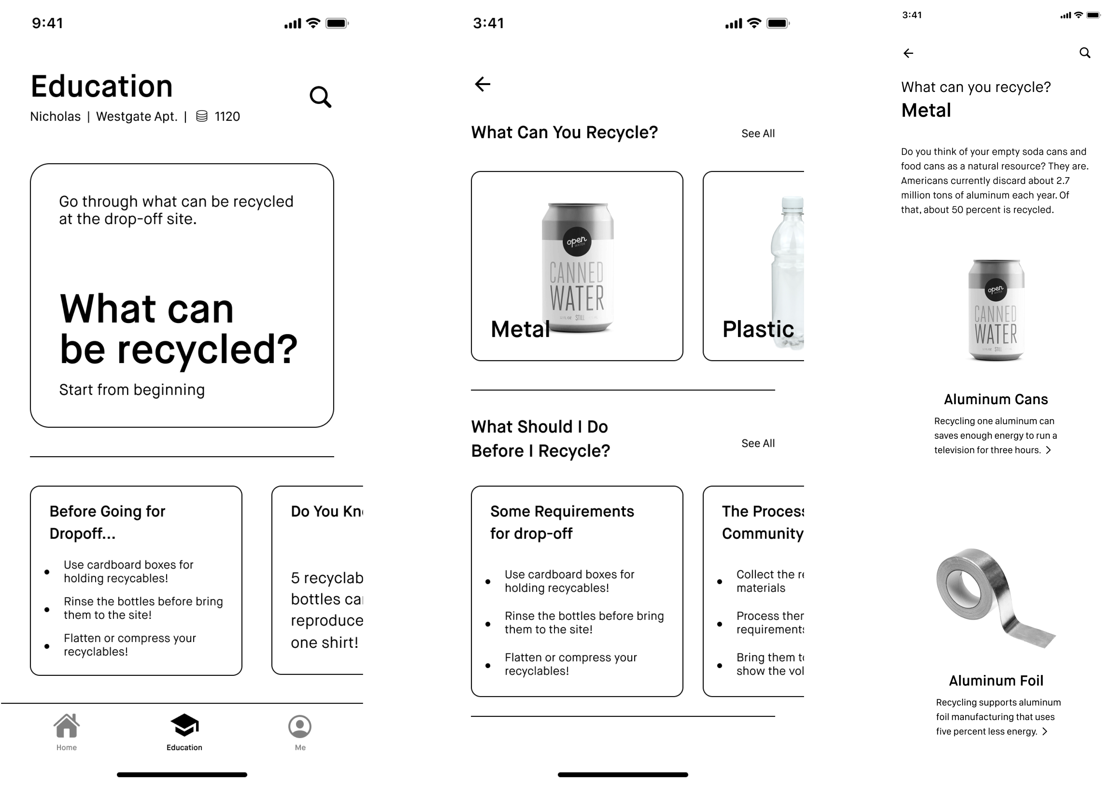 Originally we placed the educational content in setting up a recycling appointment, but multiple participants reported how redundant this process is and how vague the information provided in the prototype is. Based on this feedback, we redesigned the mandatory reading process and created denser, more interactive educational pages for the user to reference.
