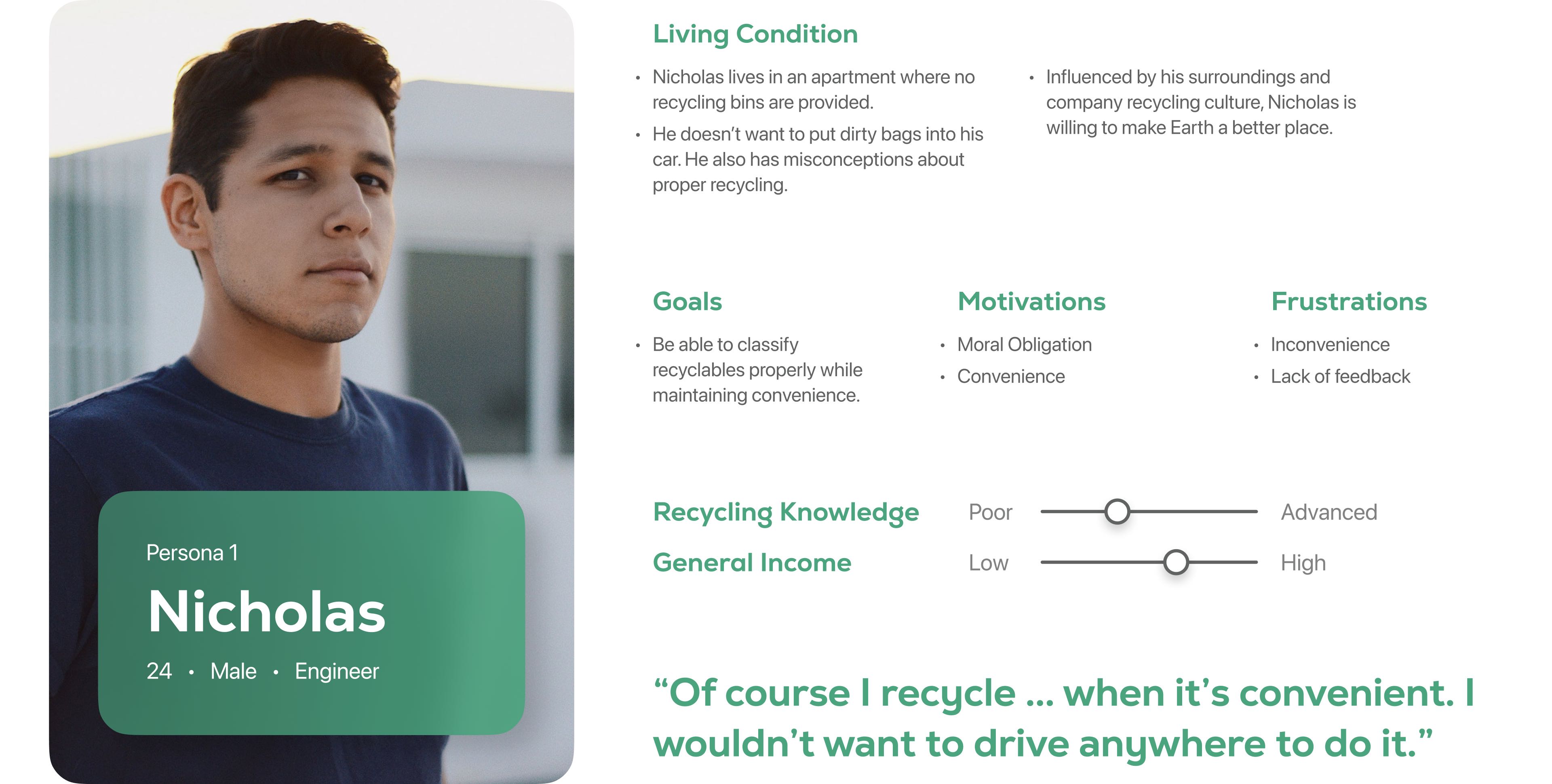 To further understand what our potential users need, we conducted 15 interviews with people aged 18 to 54, who have different experiences and unique points of view with recycling. Some interviewees provided helpful feedback regarding their opinions on what they know about recycling, why they recycle, and what problems they are facing. These insights helped us in the following process of creating the affinity diagram and our service's personas.