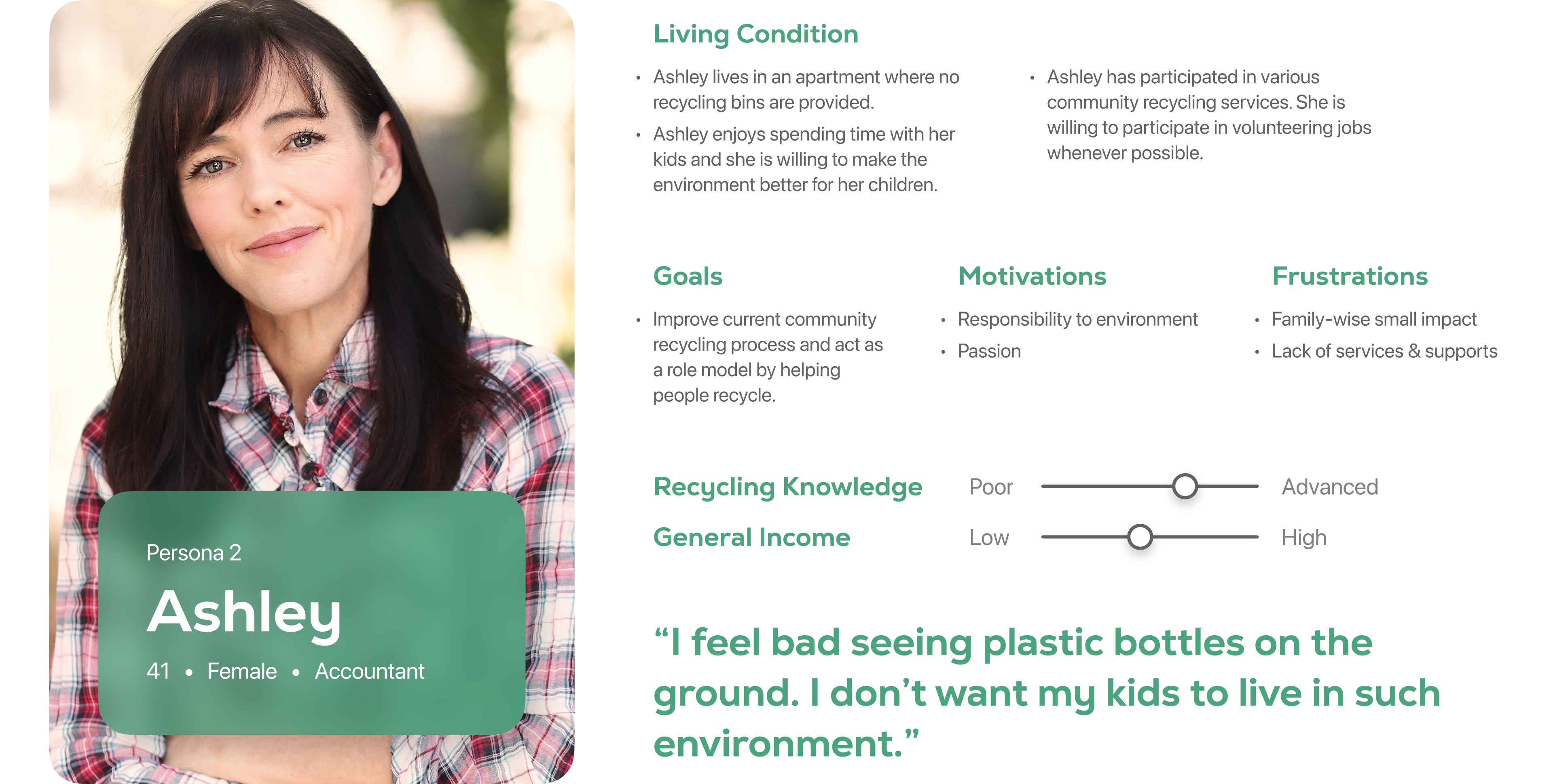 Prior to the final personas, we already created two rounds of mockup personas based on our perceptions waiting to be validated. With the insight we got from the affinity diagram, we further iterated these two personas with different backgrounds, intentions, and habits to build empathy for our users while covering as many potential users as possible. These two personas, Markus and Ashley, also indicate two main user groups for our service: recyclers and volunteers. Both of them are going to participate in the user journey in their own ways.