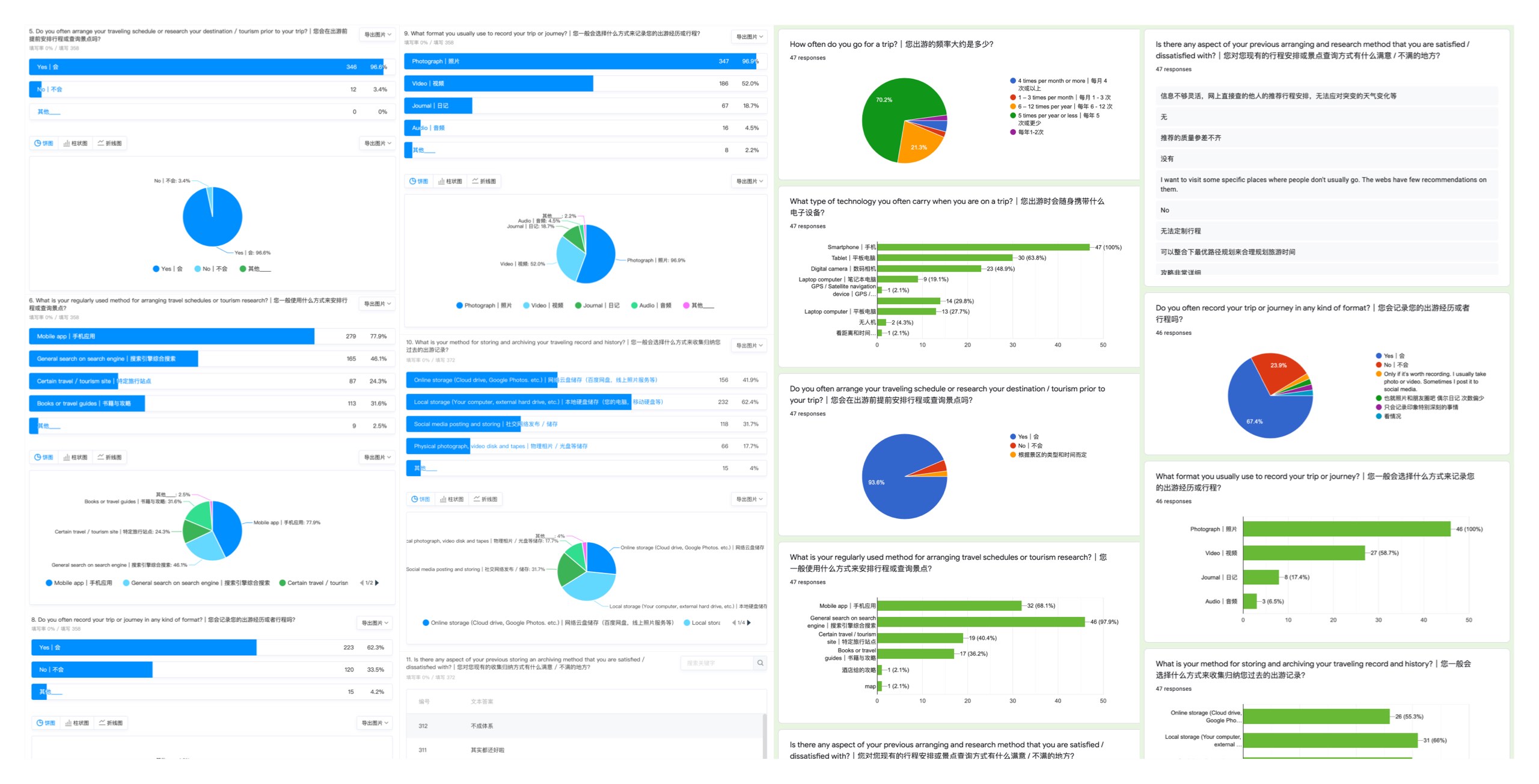 In order to understand what the users need when traveling, I conducted quantitative survey using Google Forms and Tencent Forms to collect some preliminary and general thoughts about the traveling experience from a wide range of people. The research finally collected more than 400 responses. I also interview 3 users with different habits, intentions, and characteristics when they are traveling.