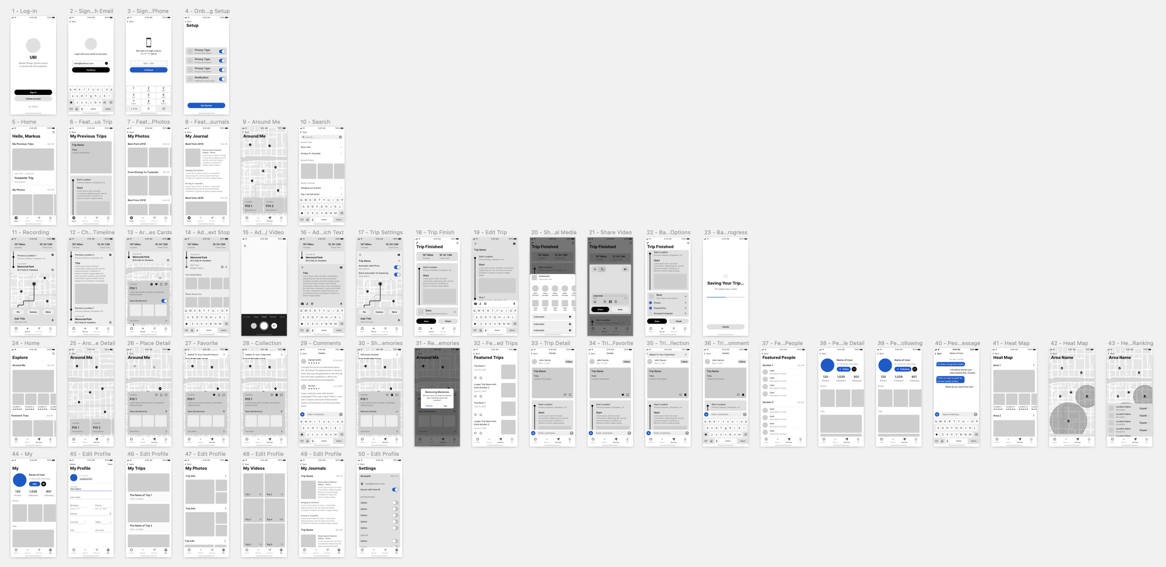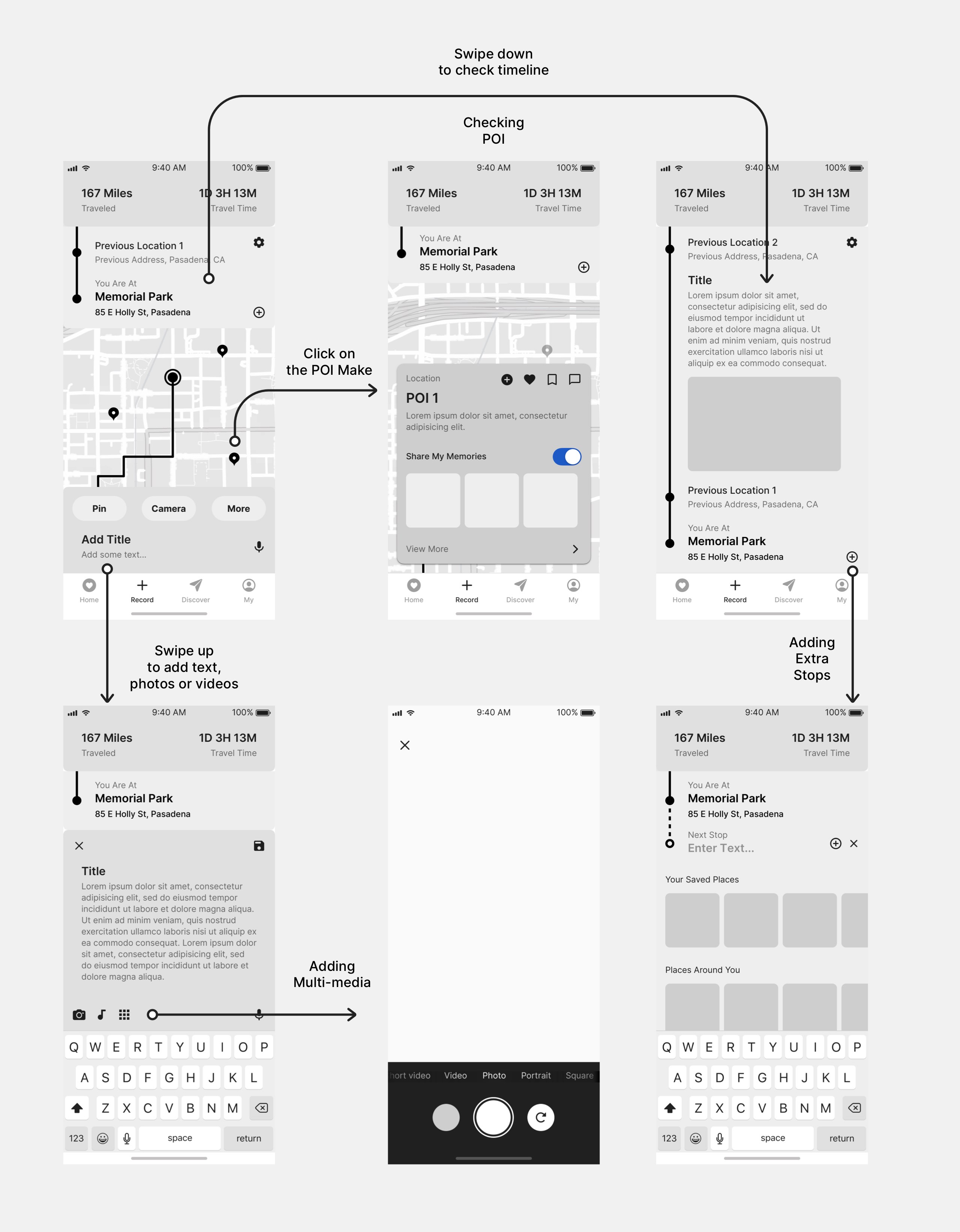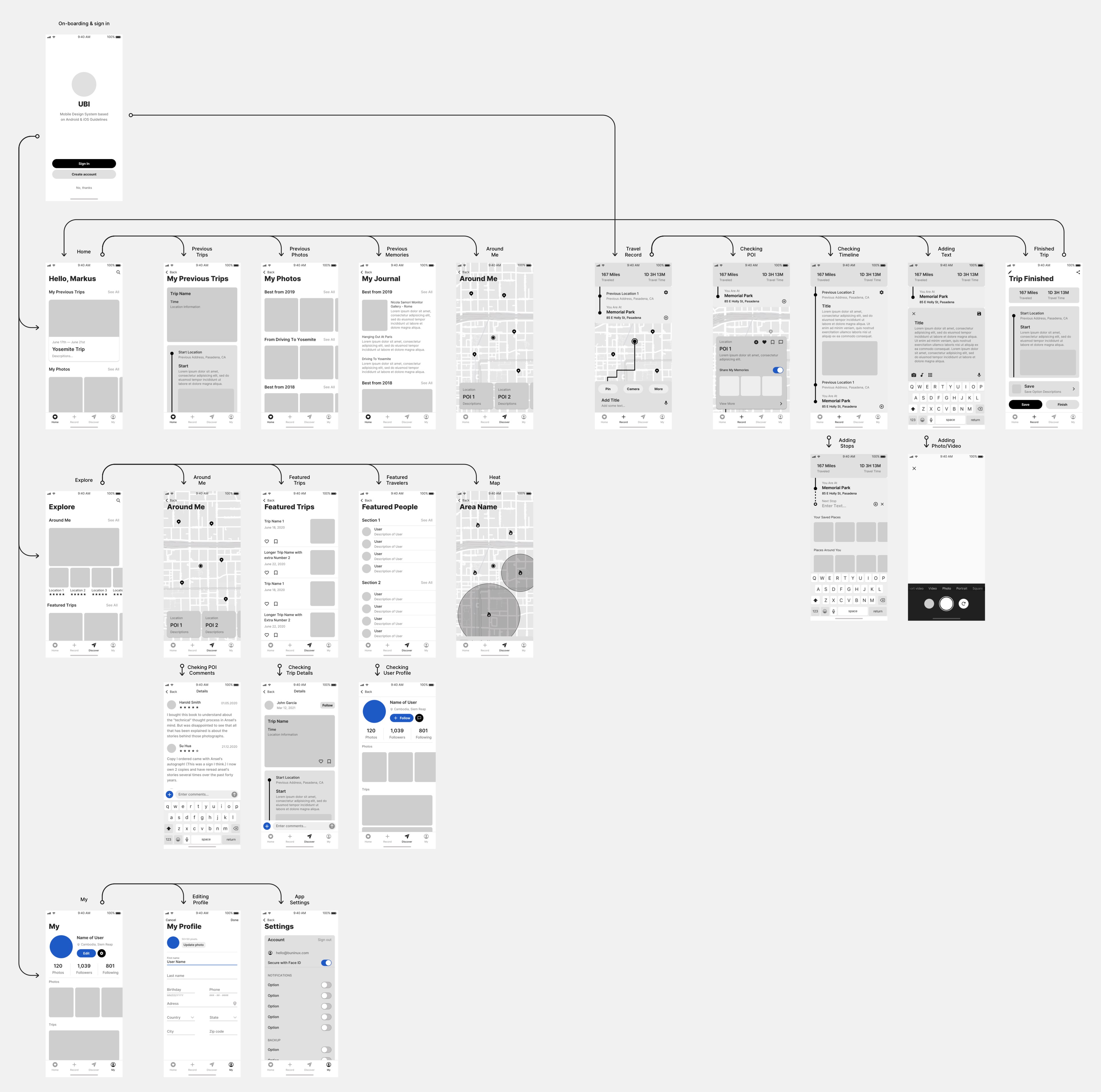 I also created multiple micro-interaction flows for the signature features in the service. This is the micro-interaction flow for in-trip recording, one of the most important features in our service. With the help of the mid-fidelity prototypes, the micro-interactions between different parts on the page are sorted out easily, including the gestures required for the user to access certain features. These flows helped me built a solid foundation for the future high-fidelity interactive prototypes.