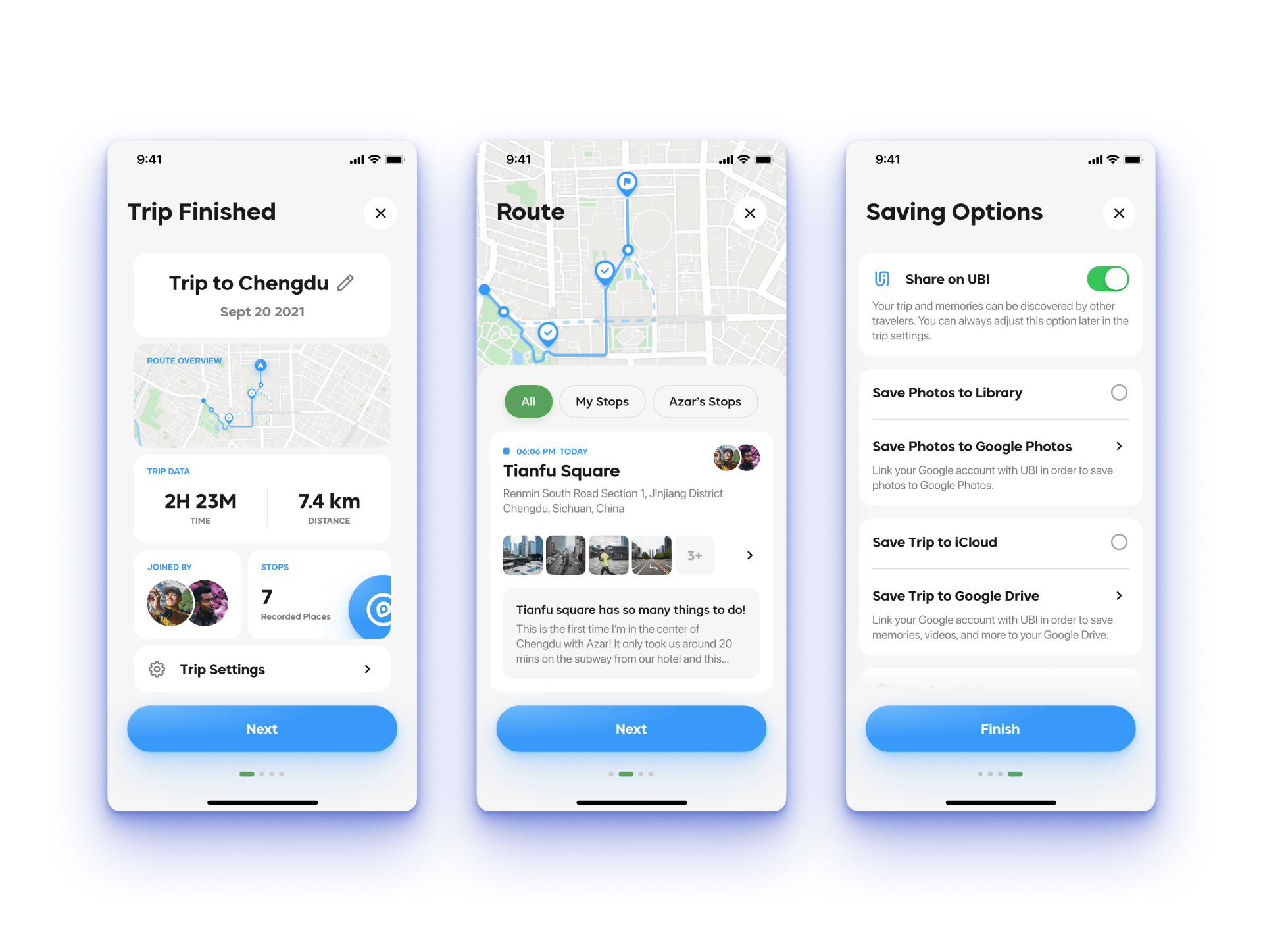 After the trip, UBI will give you a comprehensive summary. You can check all of your previous stops and save your trip to different places, including photos to your photo library and organized memories to your cloud drives.