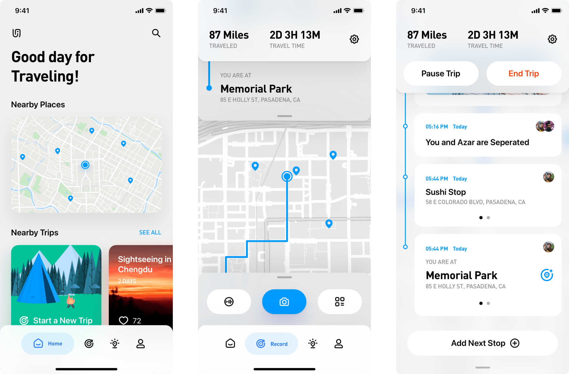 Go to the Record tab, invite friends, choose your stops, and start recording when you are ready to travel! UBI will handle all the routes during the process, and all you need to do is add stops and create memories.