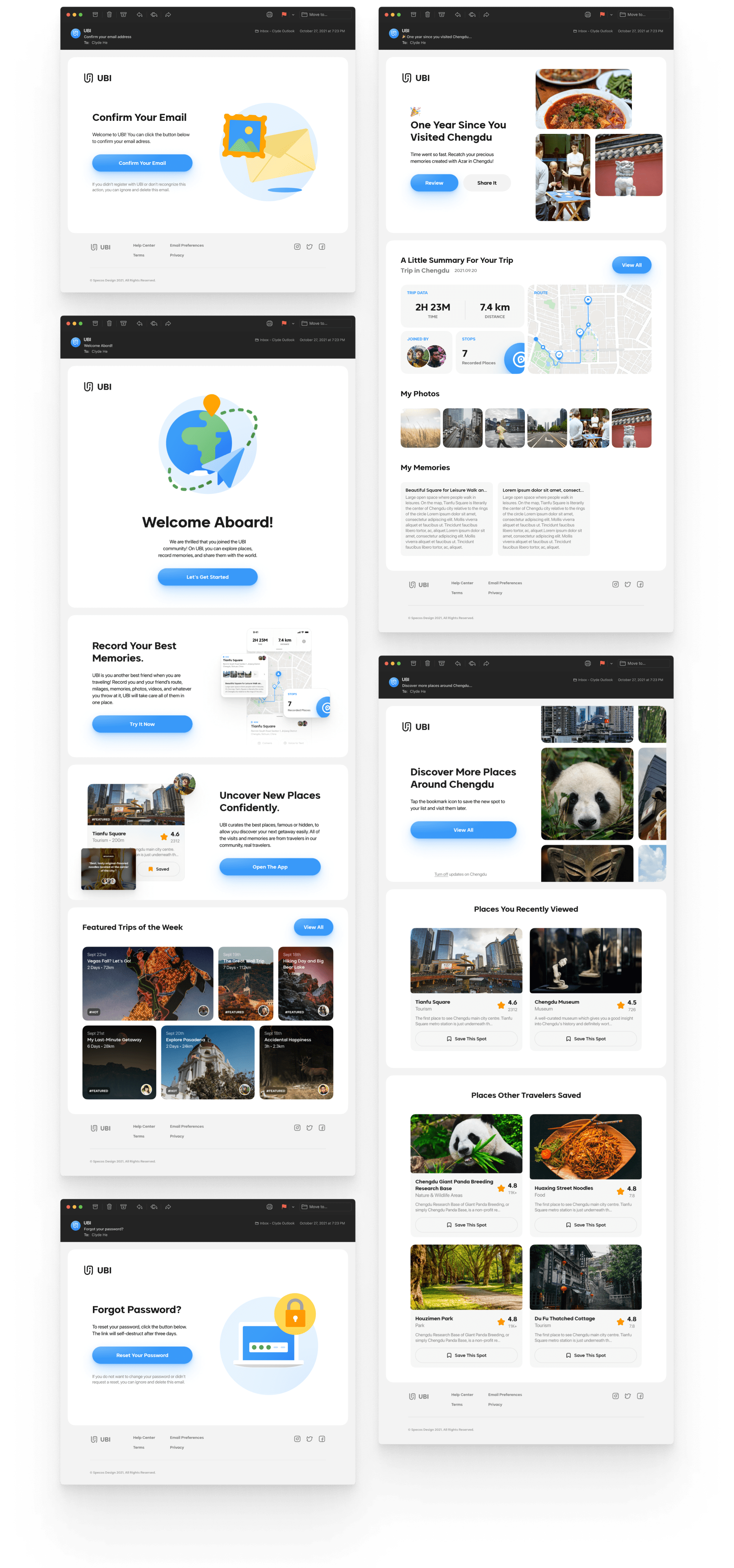 Marketing material is also crucial for a product's survivability, so I created a series of market presence materials like onboarding emails and occasional marketing emails to increase user retention over a long period, which includes yearly reviews and new trip recommendations.