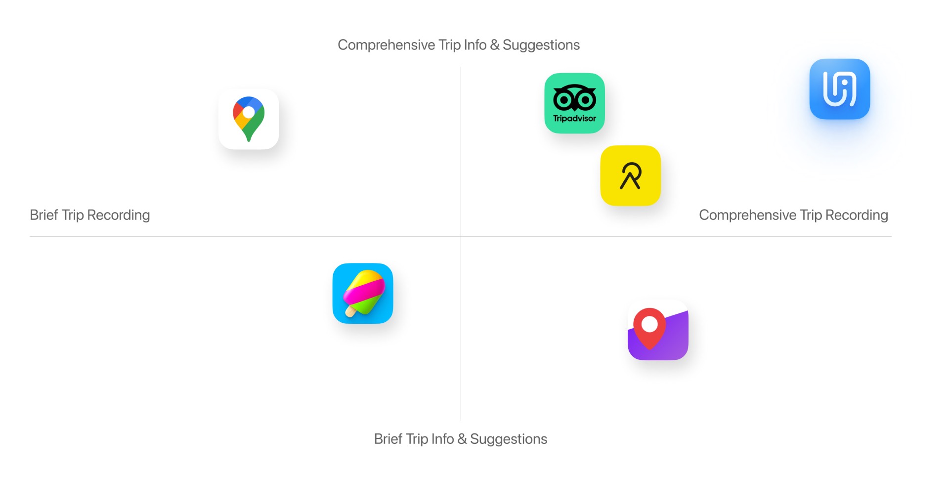 Based on the previous mockup scenario, I chose several similar competitive products on the market, including Zenly, Google Maps, and TripAdvisor, to evaluate how they fit and perform in the scenario. With the scores in mind, I created a market matrix and positioned UBI in an area where it can perform more prevail than the fellow competitors.