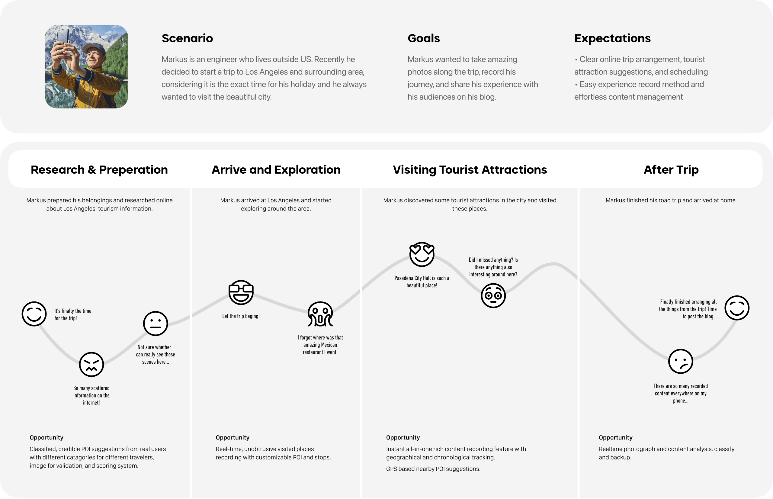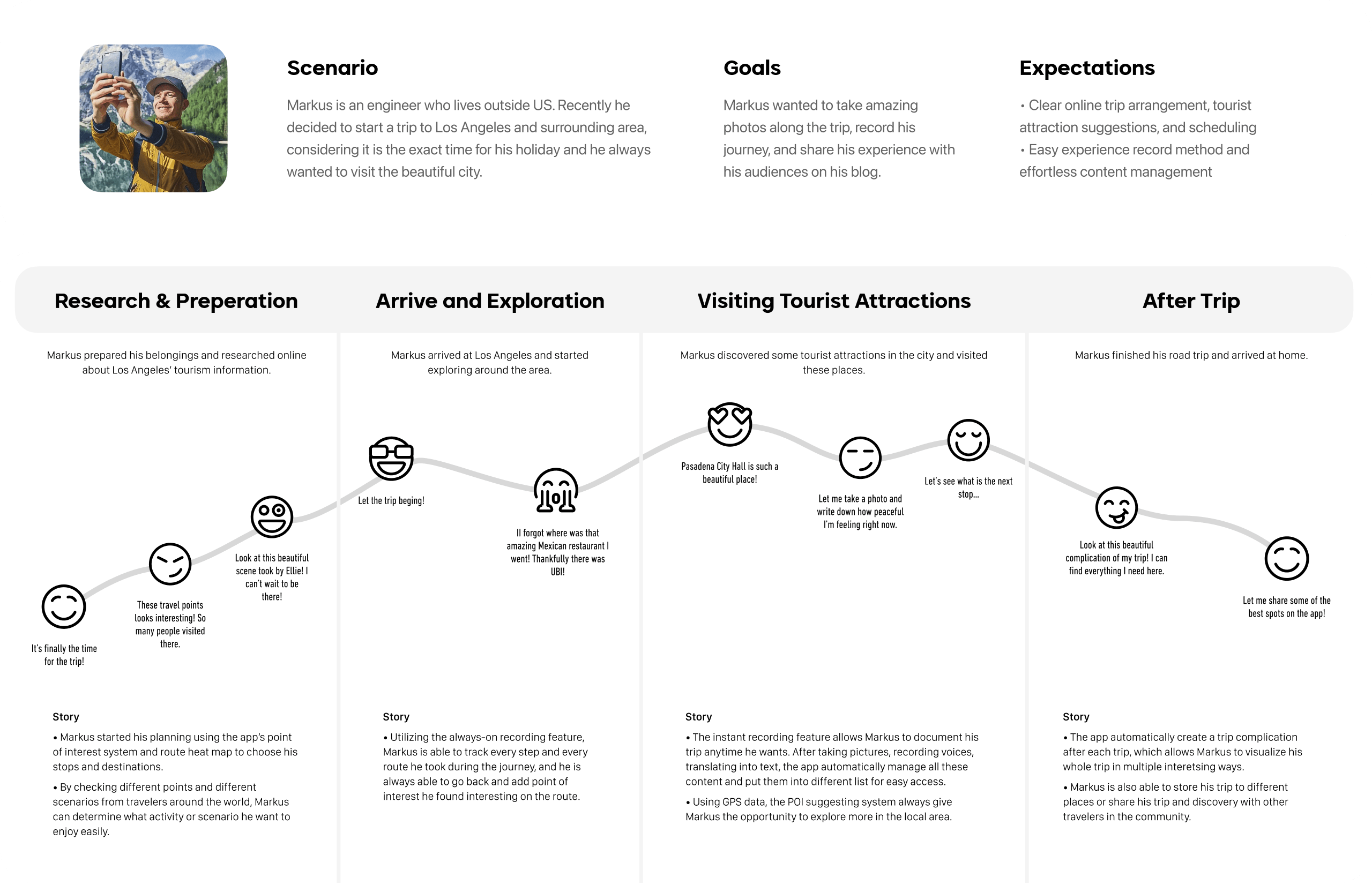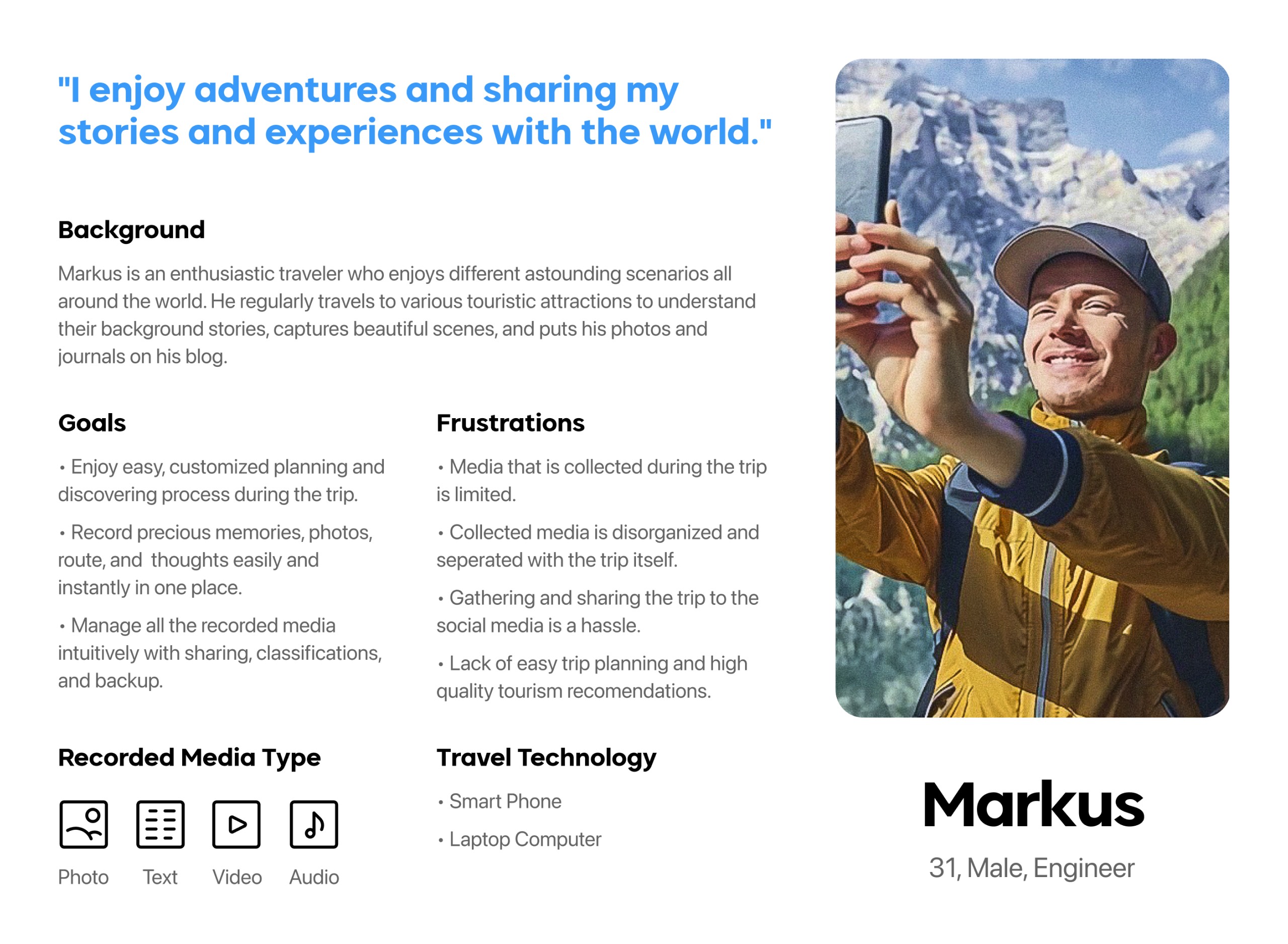 With all the previous users' needs and insights in mind, I started to think about how a fictional user can fit into the anticipated user flow and features the service provides. Therefore the primary persona of the service, Markus, is created. He is one of the best representations of our primary user group. As a traveler/blogger, his emotions and frustration help us identify where we should improve and how his journey can be optimized throughout the trip.